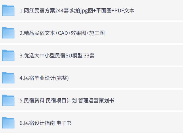 1、本贴标题:❤️【个人珍藏精品付费资源】设计必备-民宿设计方案合集【CAD方案+SU模型+软装+资料】 [32.6G]