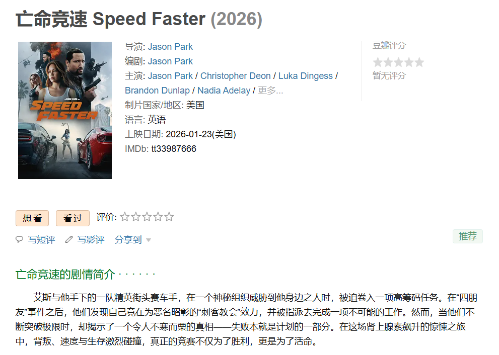 1、本贴标题:❤️【最新上线犯罪动作片】亡命竞速 Speed Faster【2026】BD1080P [中文字幕] [6.2G]