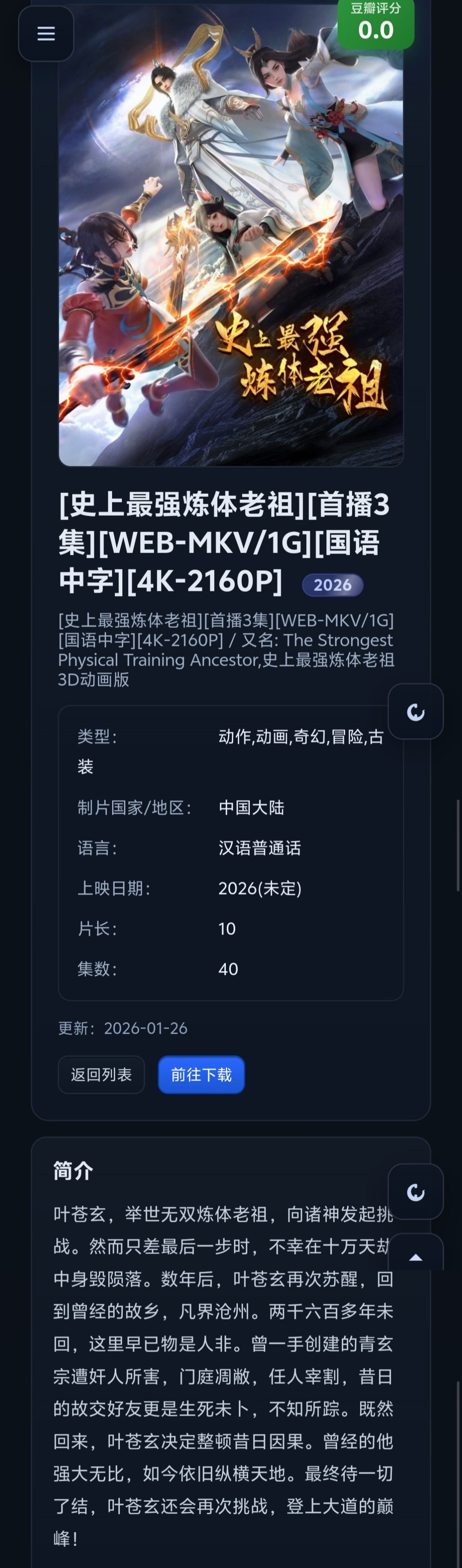 6、[史上最强炼体老祖]2026[首播3集][WEB-MKV/1G][国语中字][4K-2160P]【1.5G】免费观看全集高清网盘资源